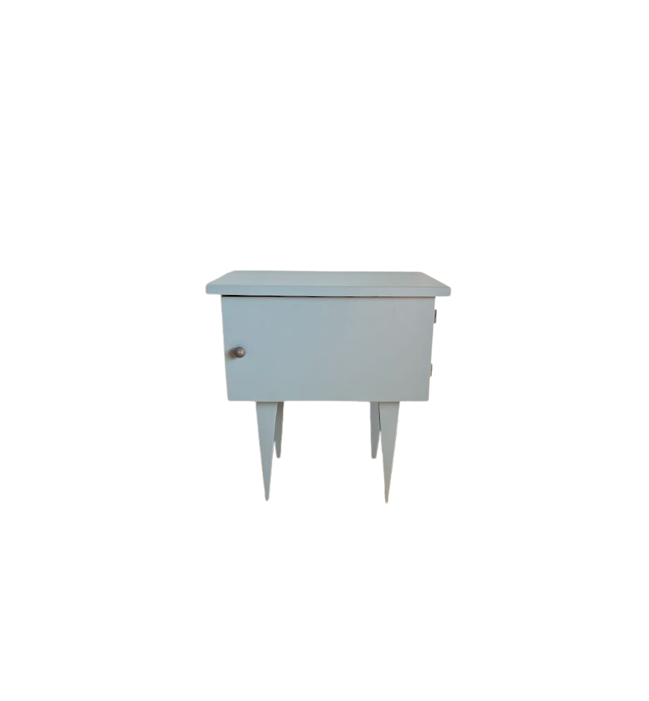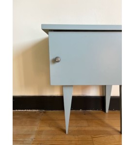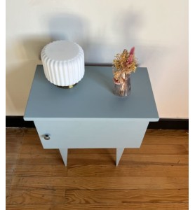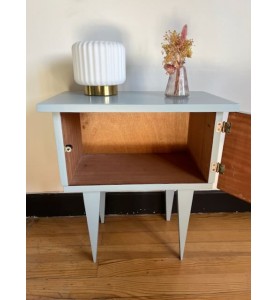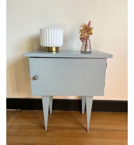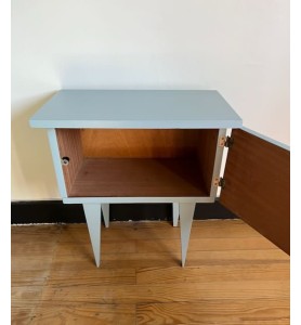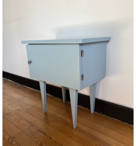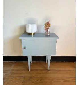 Jeanne, cette jolie table de chevet des années 60, a été repeinte dans une chouette teinte bleue grisée. La couleur est différente selon la luminosité, plus bleue dans une pièce ensoleillée et plus grise dans une pièce sombre. Elle possède un rangement fermé par une porte.