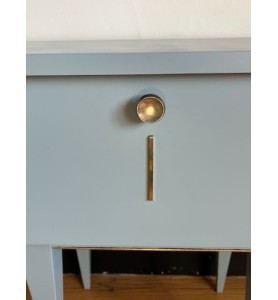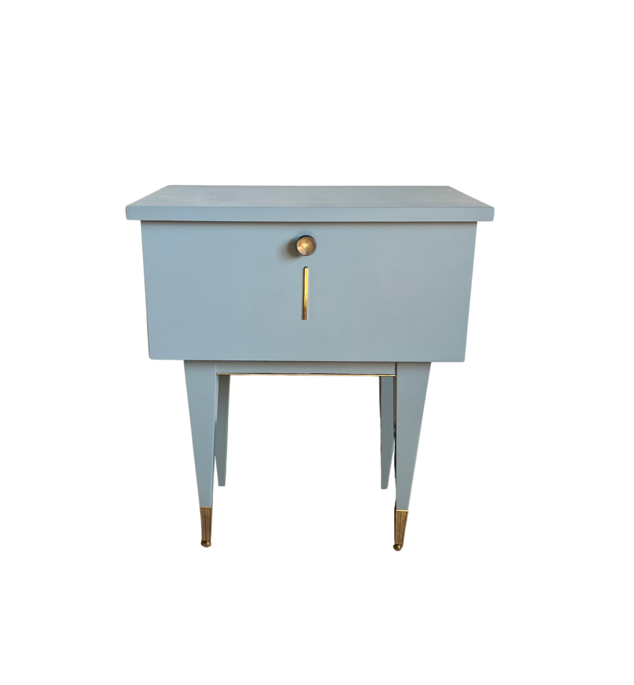 Inès, cette jolie table de chevet des années 60, a été repeinte dans une chouette teinte bleue grisée. La couleur est différente selon la luminosité, plus bleue dans une pièce ensoleillée et plus grise dans une pièce sombre. Elle possède un rangement fermé par une porte battante. De jolis détails brillants aux pieds et sur la porte lui apportent un charme fou.