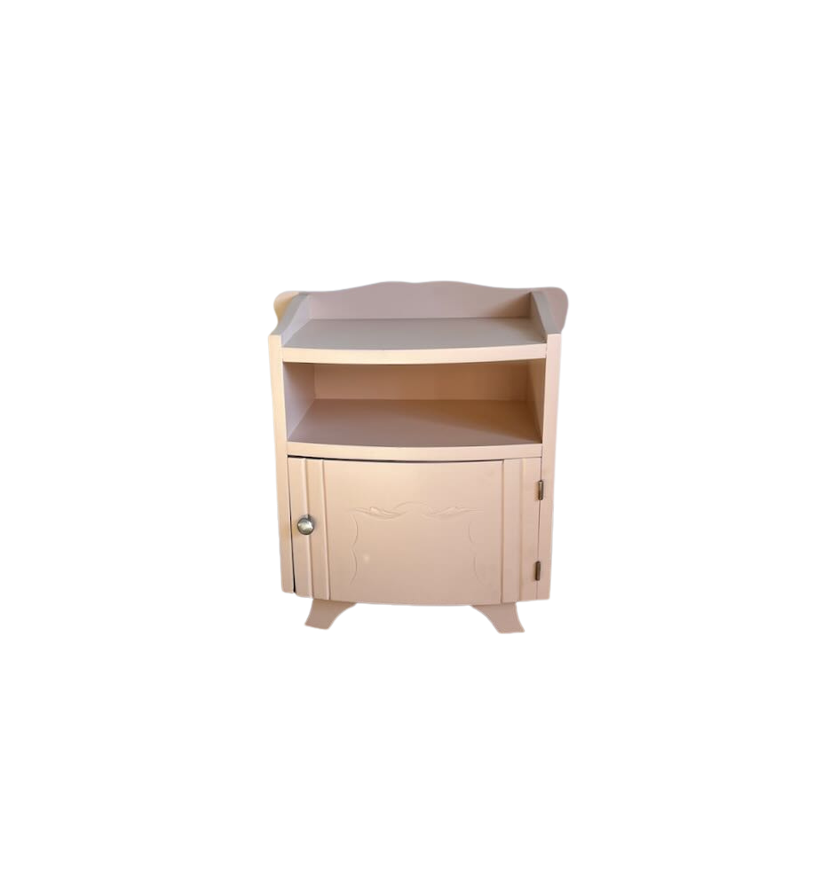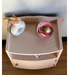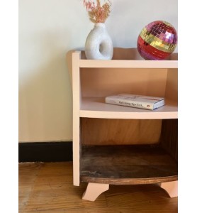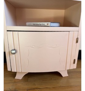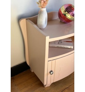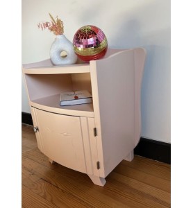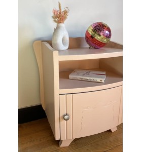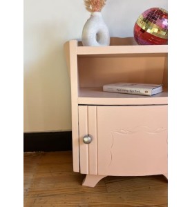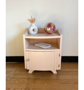 Nana est une jolie table de nuit en bois des années 60, repeinte dans une jolie teinte rose pâle ( Chamallow grillé de chez Billboquet déco, le must de la peinture : écolabel, dépolluante, notée A+ et sans COV). Elle possède un petit rangement qui s'ouvre par une porte, et une niche ouverte.