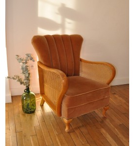 Une pièce intemporelle et cosy. Superbe fauteuil des années 50 en velours beige (un peu plus clair que sur les photos). Le joli cannage des côtés ne fait qu'ajouter du charme à ce fauteuil.