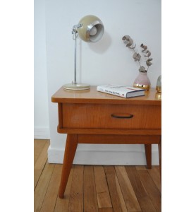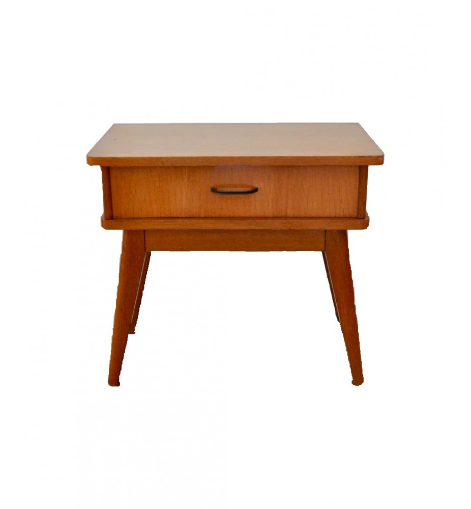Table de chevet en bois aux jolies lignes scandinaves. Elle possède un tiroir et des pieds compas.