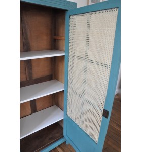 Cette jolie bonnetière saura parfaitement trouver sa place dans une chambre ou un salon. Elle a été repeinte dans un joli vert (qui tire légèrement sur le bleu), un cannage a été appliqué sur la porte. Elle possède une serrure qui ferme.