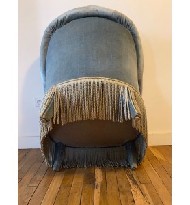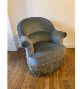 On craque pour ce pulpeux fauteuil crapaud bleu vintage. Passe partout, il trouvera sa place facilement dans votre salon ou votre chambre. Il est recouvert d'un tissu en velours bleu. Son rembourrage est d'origine en crins.
