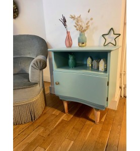 Bianca est un joli meuble repeint en vert rétro ( couleur oscillant entre le vert et le bleu selon la lumière), il possède un placard et une niche. Il peut servir de table de chevet ou de petit meuble d'appoint. Ses pieds sont en bois brut, avec des petits éperons dorés aux extrémités.