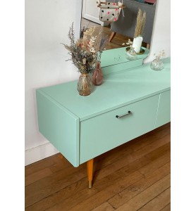 Marguerite est un meuble bas repeint dans un joli vert qui peut servir d'enfilade basse ou bien de coiffeuse grâce à son joli miroir. Il se compose de 2 placards à porte abattante. Le papier d'origine à l'esprit 70's a été conservé à l'intérieur. Ses pieds compas sont en bois. Ses dimensions lui permettront de trouver facilement sa place dans votre intérieur.