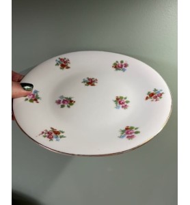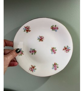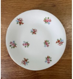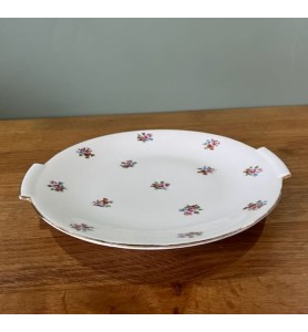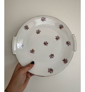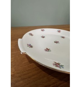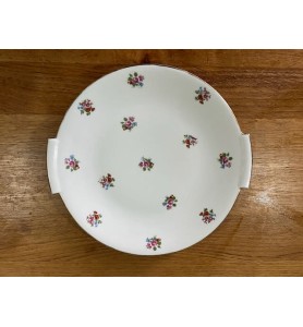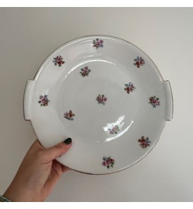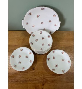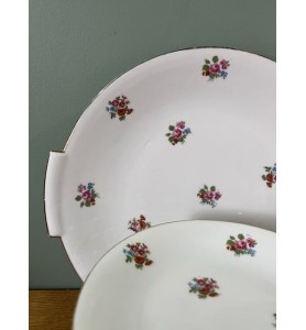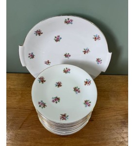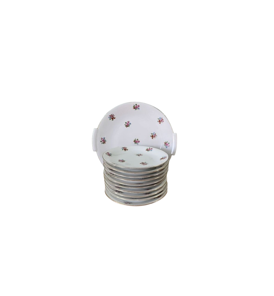 Superbe service à dessert ancien composé d’un plat de service et de 10 petites assiettes assorties. L’ensemble se distingue par un ravissant décor fleuri sublimé d’un élégant liseré doré, qui lui confère une allure résolument chic et intemporelle. Le plat de service présente une forme légèrement incurvée, idéale pour la présentation de vos desserts et gourmandises.